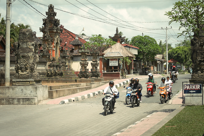 Лавки с работами ремесленников встречаются повсюду, но особенно живописно смотрится деревенька Batubulan. Практически каждый из длинной цепочки домиков, примостившихся вдоль узкой дороги — это лавка художника или скульптора. Оживленная трасса суетится, под присмотром сотен глаз разнообразных богов, бесконечно молчащих о чем-то своем и даже не провожающих путников своим каменным взглядом. Дороги Бали представляют собой отдельную тему для интереса. Движение на острове левосторонее. Большинство дорог представляет собой однополосную узкую трассу со сплошной разделительной линией и с неплохим асфальтовым покрытием. Правила ДД, как в большинстве азиатских стран, здесь никто особенно не соблюдает. Главное правило — перед маневром нужно подать сигнал в виде гудка клаксона, далее список действий почти не ограничен. Основное средство передвижения — мопед. Среди мопедов иногда встречаются автомобили :)