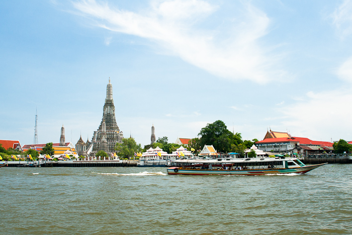 Следующей остановкой нашей прогулки был храм утренней зари — Wat Arun, который находится на противоположной стороне реки от дворца. Переплыли туда мы на специальных лодках, которые курсируют между берегами, за 3 бата на человека. По крутой, под конец почти отвесной, лестнице Ват Арун можно забраться наверх и насладиться прекрасной панорамой.