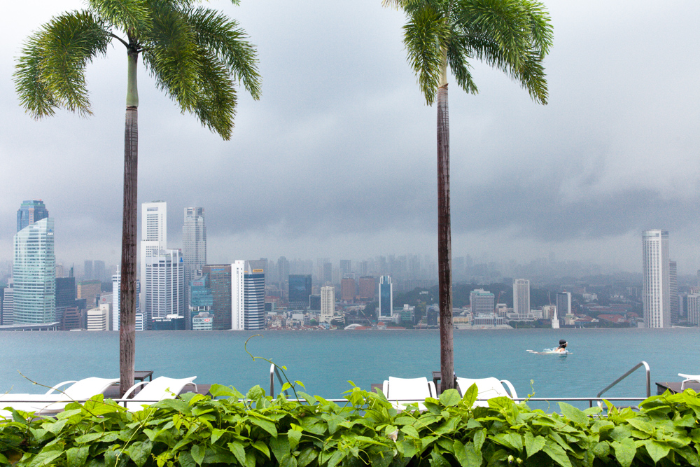 К отелю ведет необычный спиральный пешеходный мост Helix Bridge. На корабле, который плывет под облаками и одновременно является крышей отеля, располагается смотровая площадка для всех желающих, рестораны, кафе и бассейн для проживающих в отеле. Ради этого бассейна мы купили пару ночей в отеле Marina Bay Sands и ни разу об этом не пожалели! Опыт плавания на уровне облаков невероятный! Сам отель, кончено же, очень высокого уровня. Бассейн неглубокий, на всей его протяженности глубина около 1.3 метров, но зато довольно длинный. На крышу пропускают по специальным карточкам, которые выдают при заселении в отель. На карточке отмечают факт выдачи вам бумажного браслетика за каждый день посещения. Находиться на крыше совершенно не холодно, благодаря экваториальной погоде. Однако, в случае ненастья, бассейн могут закрыть. На смотровую мы не ходили, так как виды посмотрели непосредственно с края бассейна. Самое приятное, что видимость не загораживается никакими защитными сетками и стеклами. От бортика бассейна до края еще порядка двух метров, так что даже специально выпасть довольно сложно.