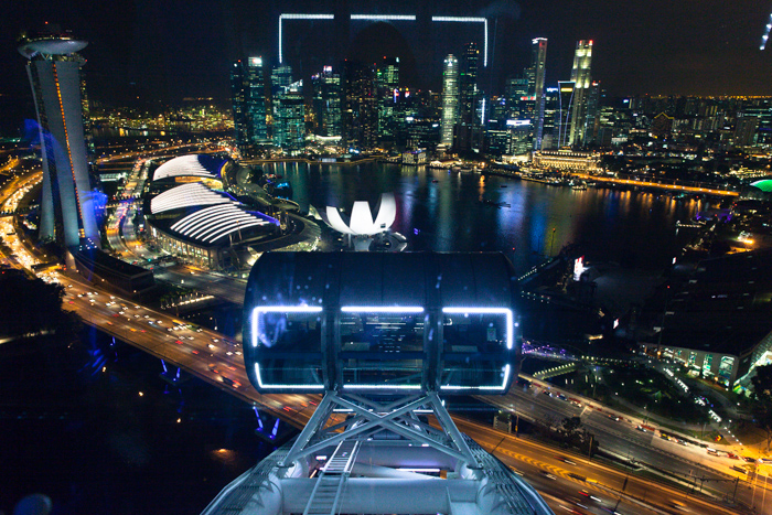 Сингапурское колесо обозрения находится тоже в районе Marina Bay и видно невооруженным глазом. Это самое высокое на данный момент в мире колесо обозрения, которое поднимает посетителей на высоту 55-этажного дома. Пассажиров сажают в просторные капсулы на 28 человек. По середине капсулы расположена скамейка для всех желающих, но вы также можете свободно ходить внутри кабинки. Полный оборот колеса занимает около получаса. Нужно ли говорить, что взору с колеса открываются головокружительные виды?