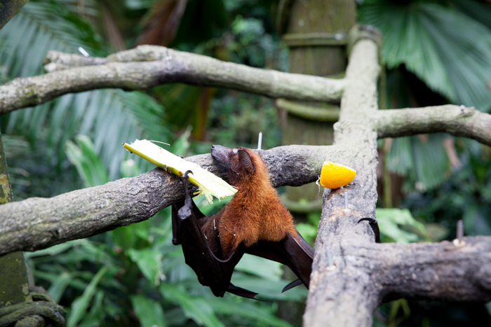 Сам сингапурский зоопарк выглядит как зеленый тропический лес, гулять по нему очень приятно. В определенные часы проводятся кормежки животных, во время которых они наиболее активны, поэтому на них интересно смотреть. Расписание кормежек написано на карте, которую можно взять при входе. Несмотря на богатое собрание интересных видов, общую аккуратность парка и хорошее состояние животных, впечатления у меня остались все-таки двоякие. Много раз, когда я читала про «самый лучший в мире зоопарк, где животные держатся в естественных условиях», я представляла себе нечто менее похожее на обычный зоопарк. Возможно, на меня бы произвели большее впечатление открытые вольеры, если бы я уже не видела подобных парков, где птицы летают над твоей головой и ходят вместе с тобой по дорожкам. Каким бы он ни был, это зоопарк, а не заповедник, и места многим животным маловато.
