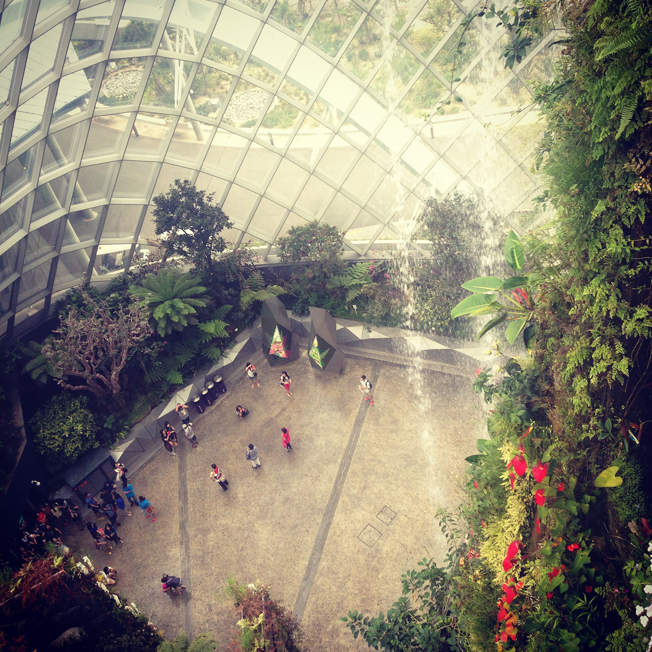 Также к садам относятся два крытых парка: Flower Dome и Cloud Forest. Flower Dome — это сборник красивых и интересных растений со всего мира, а внутри Cloud Forest находится нечто необычное. Попадая внутрь, вы видите перед собой огромный по высоте (30 метров) водопад, срывающийся с вершины искусственного холма, покрытого растениями. Вдоль «холма» также проложены дорожки на различной высоте, а внутри располагается лифт. Климат, созданный для растений внутри Cloud Forest довольно прохладный, имейте ввиду! За вход на подвесную дорожку вдоль деревьев мы отдали 5S$ за человека. За вход в крытые сады 28S$ с человека за оба, можно брать по-отдельности. Подробнее