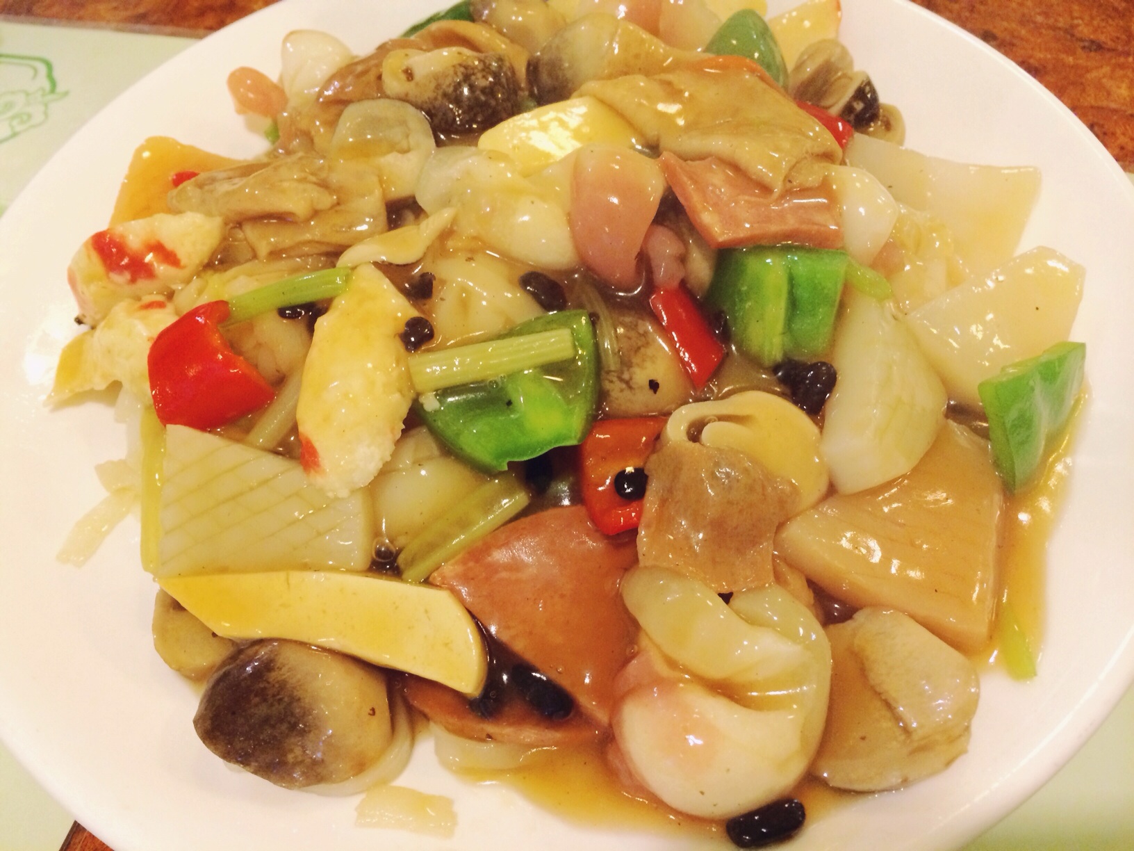 Надо сказать, что не все имитации получаются приятными на вкус и по ощущениям. Это традиционное для китайцев блюдо “мешанина из белка”, которое изображает лапшу с разнообразными морепродуктами, грибами и ветчиной, на вкус было очень странное, а по консистенции так и совершенно отвратительное, на мой вкус: