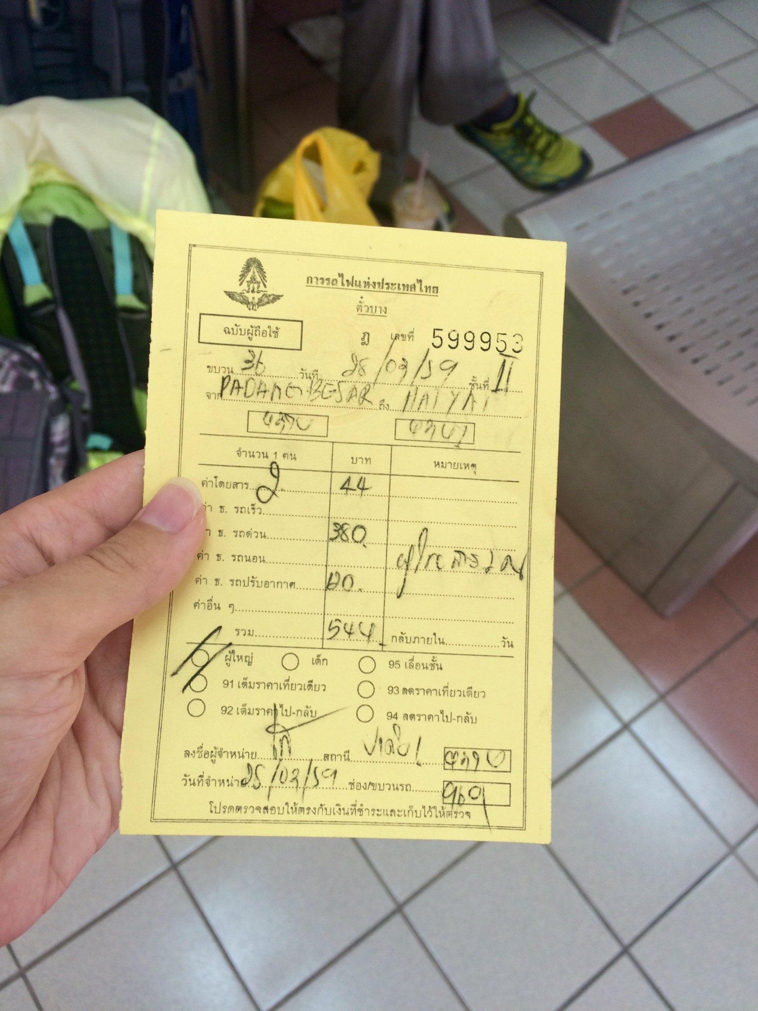 После погранконироля нам предстоял следующий квест: купить билет до Хат Яй. Большинство остальных пассажиров были уже с билетами. Мы пошли искать кассы. Они оказались на втором этаже. Там нас отправили в офис тайских железных дорог, который находится внизу на платформе 1 (где и стоял наш поезд). Человеческих обменников валюты нигде видно не было, хотя в интернете пишут, что обменники есть. Кроме погранконтроля и касс на станции есть одно кафе, которое принимает, и MYR, и THB (может, это и есть «обменник»?). В офисе ЖД Таиланда билеты продавали за THB. Там же нам предложили поменять MYR на THB по чуть более выгодному курсу, чем у проводника и в кафе. Билет на одного стоил 272 THB и выглядел как странная желтая бумажка :) С ценой особый юмор: до Паданг Бесара мы ехали больше 4 часов и заплатили 3$, до Хат Яй ехать меньше часа, но билет стоит почти 8$. Мы предположили, что это как бы оплата постфакиум за всю дорогу от Баттерворта, так как поезд принадлежит Таиланду.