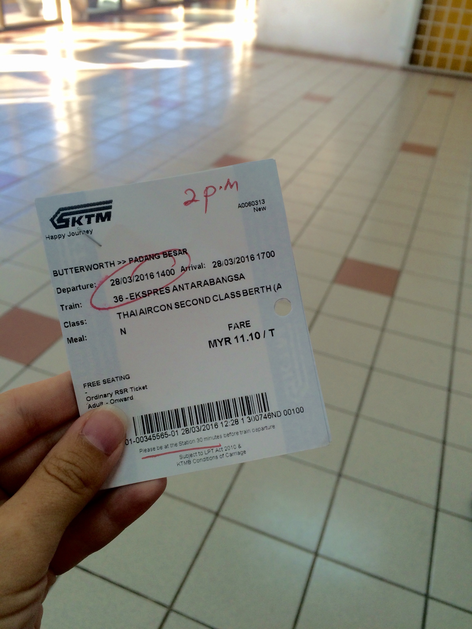 За день до отъезда мы отправились в Баттерворт разведать обстановку и купить билеты. На вокзал от причала можно пройти сразу с парома по крытому переходу. Вокзал — это громко сказано, сейчас он представляет из себя скорее провинциальную платформу, но в процессе строительство крупного транспортного узла на этом месте. Кассы находятся на втором этаже (есть информация, что билеты также можно купить на стороне Джорджтауна в ларьке KTM у причала). Неожиданности начались, когда мы сказали кассиру на вокзале, что хотим билет до города Хат Яй (Hat Yai). Она ответила, что билеты мы можем купить только до границы, станции Паданг Бесар (Padang Besar, 11.4MYR), и только перед посадкой в поезд, в тот же день. Билет до Хат Яй мы должны были купить в Паданг Бесаре.