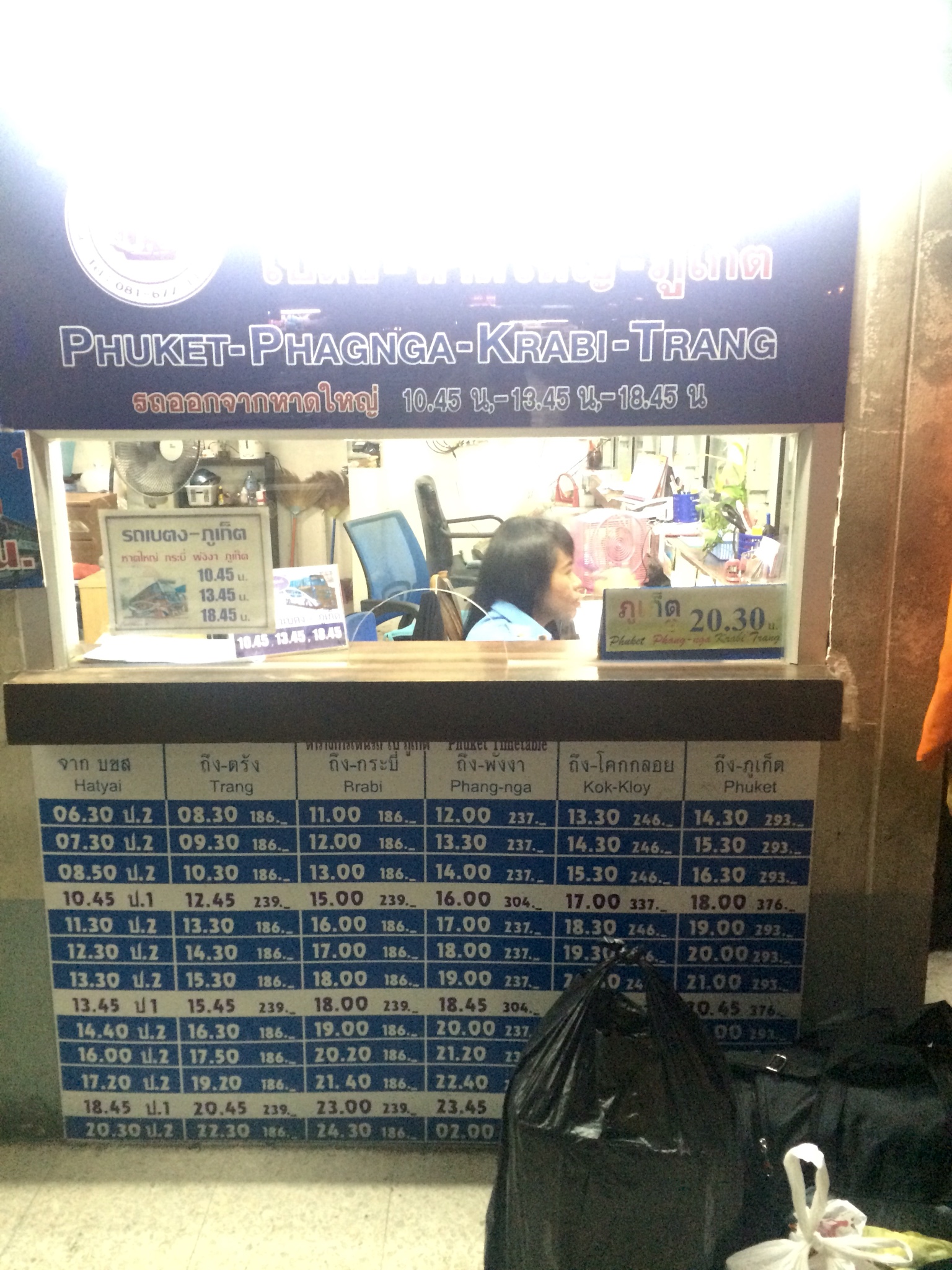 Главная задача была успеть на последний автобус до Краби, чтобы не ночевать в Хат Яй. На станции в крайней кассе, где висит расписание, нам продали билет на 20:30 за 162THB, хотя на плакате цена на этот час 186THB. Продажу организовал сам водитель, стоящий рядом с кассой. Наверное, что-то пошло мимо кассы…