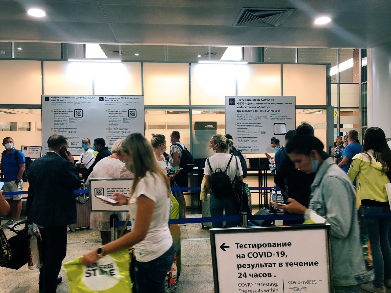 Тест на коронавирус методом ПЦР (это важно) необходимо сдать и загрузить результат на госуслуги в течение 72 часов с момента въезда в Россию, иначе грозит штраф. Теоретически можно сделать это бесплатно в районной поликлинике, но мы оценили риски не успеть как высокие. В аэропорту Шереметьево сейчас предоставляется платная услуга по сдаче анализа на COVID-19, мы решили ей воспользоваться. Также знакомые сказали, что им удалось успеть сдать платный тест в клинике МЕДСИ в Москве.